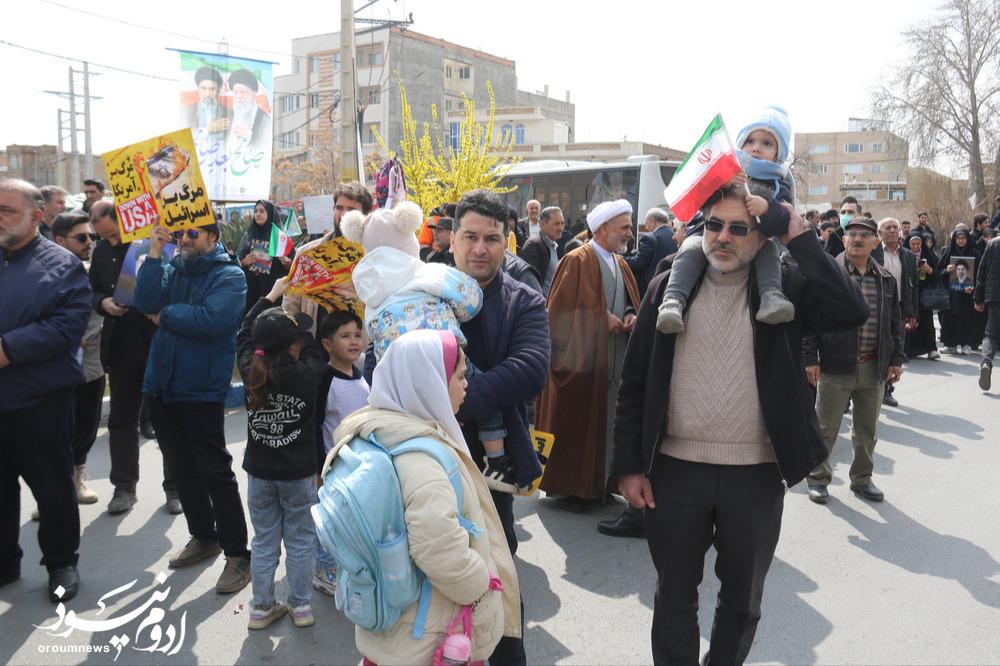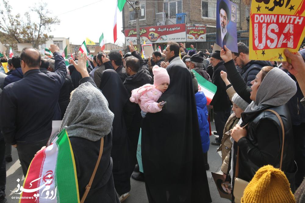 صدای مرگ بر آمریکا و مرگ بر اسرائیل از هر کوچه برمی‌خیزد. این شعارها اما امسال معنای عمیق‌تری دارد. مردم ارومیه می‌خواهند به جهان فریاد بزنند که جنایات آمریکا و رژیم صهیونیستی در غزه و فلسطین را فراموش نکرده‌اند. زنان چادری، با کودکان خردسال در بغل، مردانی با پیشانی‌های پینه‌بسته از سجود، و جوانانی که فرداهای این مرز و بوم را خواهند ساخت، همگی یکصدا می‌گویند که حامی کودکان ستمدیده غزه و فلسطین هستند.